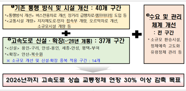 이 중 63개 곳(360.4km)에 대해 40개 구간은 기존 통행방식 및 시설 개선 방안을 적용하고 37개 구간(14개 중복)은 2026년 개통 예정인 고속도로 신설·확장을 추진해 2026년까지 상습 교통정체 길이 30%(429.9→300.9km) 감축을 목표로 추진할 계획이다.