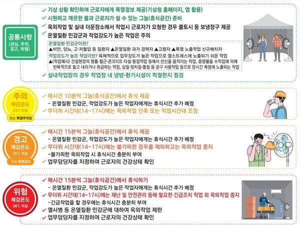 정부가 폭염 현장에서 일하는 근로자의 온열질환을 예방하기 위해 폭염 조치 ‘관심-주의-경고-위험’ 등 단계별 조치사항을 권고했다.