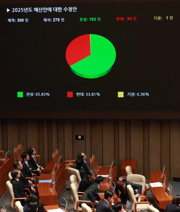 국회 심사 과정에서 총지출 규모는 정부 예산안 대비 4조 1000억 원 감액돼 677조 4000억 원에서 673조 3000억 원으로 축소됐고, 총수입은 651조 8000억 원에서 651억 6000억 원으로 조정됐다.