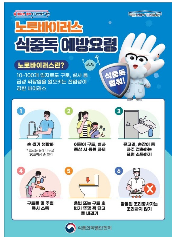 식품의약품안전처는 27일 겨울철 어린이집, 유치원 등을 중심으로 노로바이러스 식중독 발생 의심 신고가 증가함에 따라 개인 위생관리 등 식중독 예방수칙을 준수해 달라고 당부했다.