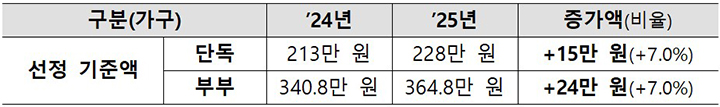보건복지부는 올해 선정기준액은 단독가구 기준으로 지난해 대비 15만 원 높아진 바, 이는 65세 이상 노인의 근로소득이 지난해보다 11.4%, 공적연금 소득이 12.5% 상승한 영향이라고 설명했다.