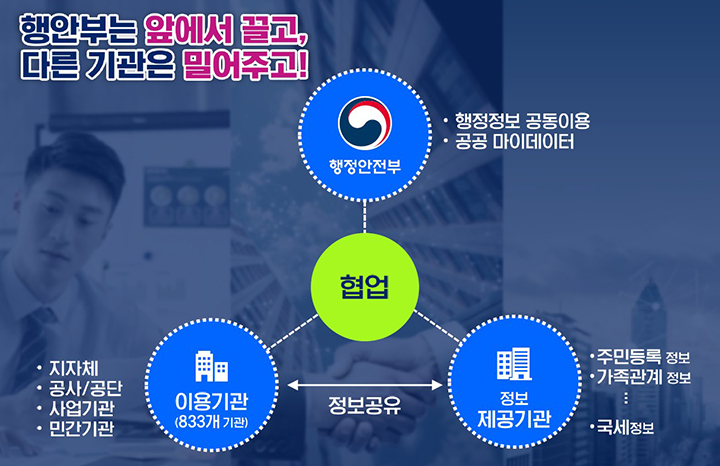 이에 현재 지자체, 공공기관, 교육청, 은행 등 800여 개 기관이 주민등록표 등·초본 등 174종의 정보를 다른 행정기관으로부터 실시간으로 제공받아 이용하고 있다.